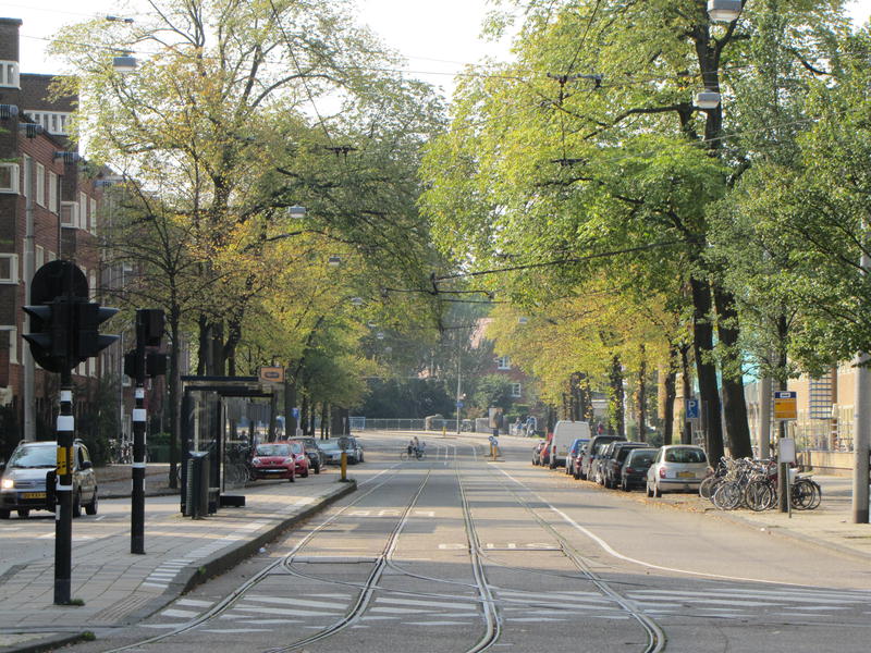 Zacznijmy od Beethovenstraat, łączącej historyczne centrum miasta z dzielnicą biurową w rejonie dworca południowego (Amsterdam Zuid). 2 pasy autobusowo-tramwajowe, 2 pasy dla samochodów (po jednym w każdym kierunku), 2 pasy parkowania równoległego między skrzyżowaniami, 2 szpalery drzew. Za szpalerami drzew ścieżki rowerowe i chodniki.