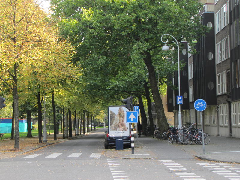 Oczywiście Apollostraat też ma przekrój 2x1 – ale z szerokim pasem zieleni zamiast linii tramwajowej między jezdniami.