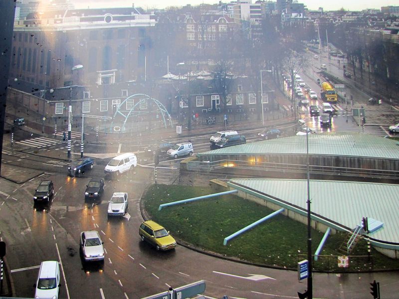 Rok 2005, widok na południe, w stronę Synagogi Portugalskiej i Weesperstraat. Przejście podziemne już zostało zamknięte i zagospodarowane, wyznaczono przejścia naziemne, ale straszy jeszcze jezdnia wokół placu.