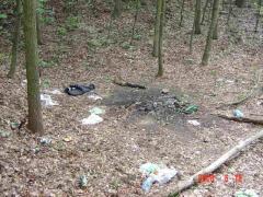 4. Zwiększenie nadzoru nad ul. Dewajtis i nad całym Lasem przez patrole rowerowe straży miejskiej i policji. Patrole zmotoryzowane są całkowicie nieskuteczne w ściganiu dewastacji lasu i naruszania zasad obowiązujących na jego terenie. Piesze będą mało efektywne. (na zdj. pozostałości ogniska w głębi rezerwatu - liczne śmiecie, zniszczenia ściółki i połamane gałęzie).