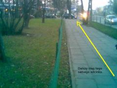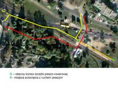 W tym miejscu ścieżka przecinałaby chodnik. Warto zastosować tu jakieś rozwiązanie, które skłoniłoby rowerzystów do zachowania szczególnej ostrożności.
