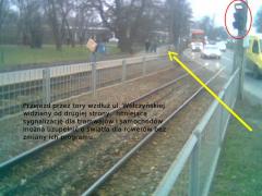 Przejazd przez tory wzdłuż ul. Wólczyńskiej widziany od drugiej strony. Istniejącą sygnalizację dla tramwajów i samochodów można uzupełnić o światła dla rowerów bez zmiany ich programu.