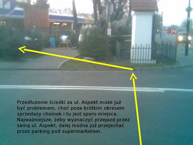 Przedłużenie ścieżki za ul. Aspekt może już być problemem, choć poza krótkim okresem sprzedaży choinek i tu jest sporo miejsca. Najważniejsze, żeby wyznaczyć przejazd przez samą ul. Aspekt, dalej można już przejechać przez parking pod supermarketem.