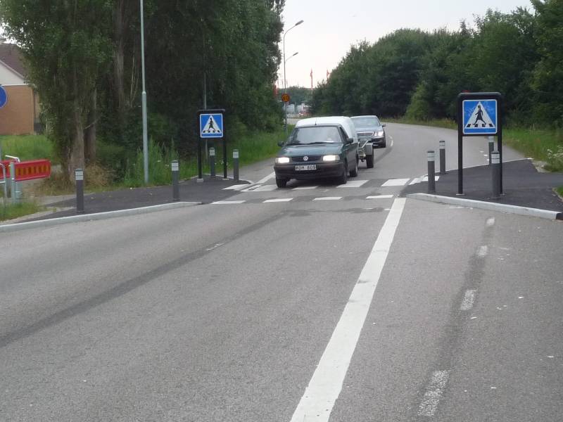 Na tym zdjęciu z 2012 roku widzimy aktualną sytuację na tym samym przejściu. Zlikwidowano sygnalizację świetlną instalując równocześnie z obu stron punktowe szykany zwężające jezdnię do... 3,5 metra! Kiedy nic nie jedzie, pieszy nie musi wciskać przycisku i czekać na zielone. A kiedy jedzie - wystarczy wejść na azyl, co czytelnie sygnalizuje kierowcom zamiar przejścia i zgodnie ze szwedzkim prawem obliguje do zatrzymania pojazdu. Tak dąży się do poprawy bezpieczeństwa na poważnie, a nie na niby jak w Polsce.