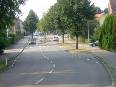 Na tym fragmencie mapy z biegnącą poziomo żółtą Malmövägen widać kolejne podobieństwo do al. Reymonta – droga oddziela niebezpieczną, dokuczliwą barierą osiedla położone z obu stron przy prostopadłych uliczkach. Pomarańczową obwódką oznaczono lokalizację przejścia dla pieszych, któremu zaraz przyjrzymy się dokładniej.