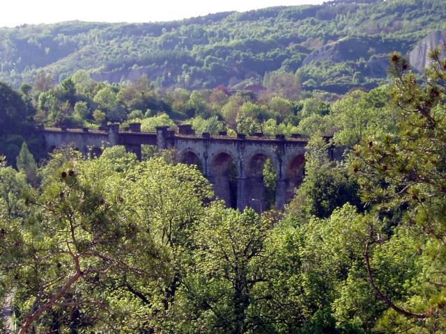 Widok z tramwaju na równoległy wiadukt kolejowy.