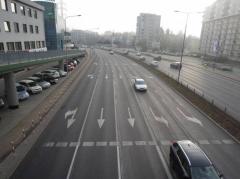 Ulica Rzymowskiego ma w tym miejscu aż dziewięć pasów ruchu (łącznie z pasami do skrętów).