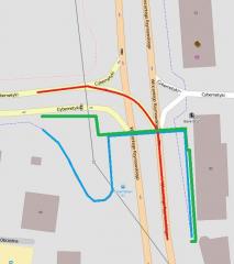 Schemat skrzyżowania ulic Rzymowskiego i Cybernetyki uwzględniający trasę samochodów, pieszych i rowerzystów skręcających z ulicy Rzymowskiego w lewo w ulicę Cybernetyki. Kolorem czerwonym oznaczono trasę samochodu, kolorem zielonym trasę pieszego, kolorem niebieskim trasę rowerzysty.