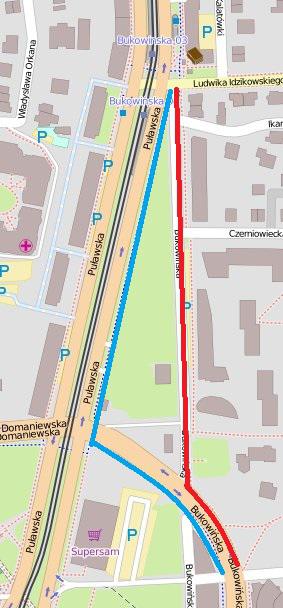 Rowerzysta jadący drogą dla rowerów po zachodniej stronie ul. Bukowińskiej/Domaniewskiej nie ma również możliwości wyboru najkrótszej trasy czyli łącznika ul. Bukowińskiej z ul. Idzikowskiego (pojazdy jadące jezdnią na zasadach ogólnych z południa na północ mają taką możliwość). [Na rysunku zaznaczono przebieg możliwej trasy kierowcy samochodu jadącego w kierunku południe-północ (kolor czerwony) oraz rowerzysty jadącego w tym samym kierunku poruszającego się drogą dla rowerów (kolor niebieski) z punktem docelowym na skrzyżowaniu ul. Puławskiej i Idzikowskiego.]
