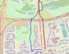 Rowerzysta jadący drogą dla rowerów po zachodniej stronie ul. Bukowińskiej/Domaniewskiej nie ma również możliwości wyboru najkrótszej trasy czyli łącznika ul. Bukowińskiej z ul. Idzikowskiego (pojazdy jadące jezdnią na zasadach ogólnych z południa na północ mają taką możliwość). [Na rysunku zaznaczono przebieg możliwej trasy kierowcy samochodu jadącego w kierunku południe-północ (kolor czerwony) oraz rowerzysty jadącego w tym samym kierunku poruszającego się drogą dla rowerów (kolor niebieski) z punktem docelowym na skrzyżowaniu ul. Puławskiej i Idzikowskiego.]