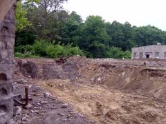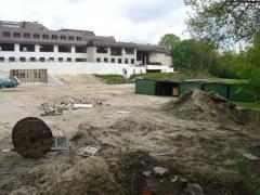 Zdjęcie placu budowy z połowy czerwca, na drugim planie ściana lasu - ostoi dzikiej zwierzyny.