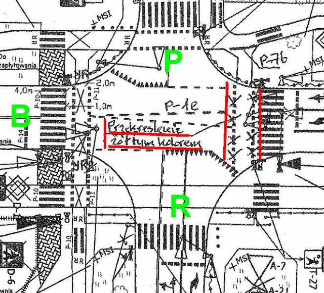 Teraz nie ma już wątpliwości - na projekcie dopisano Przekreślenie żółtym kolorem likwidujące przejazd. (B=Broniewskiego, P=Perzyńskiego, R=Rudnickiego)