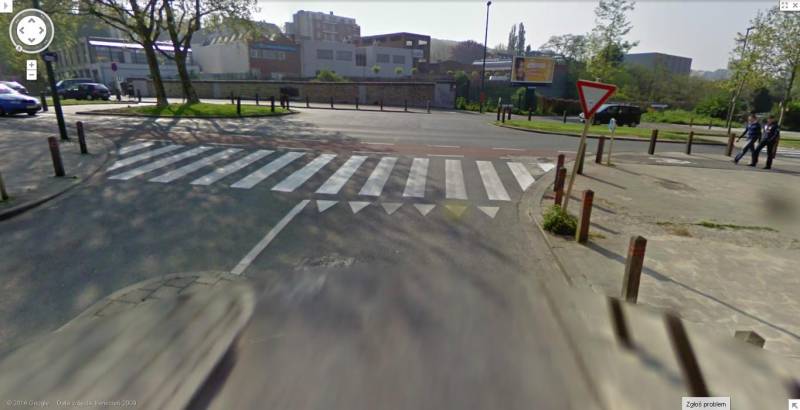 Zdjęcie archiwalne z przeciwnego kierunku dobrze pokazuje dystans 10-14 metrów, jaki mieli do pokonania piesi przechodząc przez jezdnię. (Fot. zapożyczona z Google Street View.)