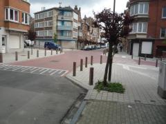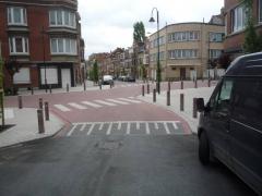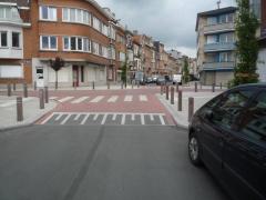Spójrzmy teraz na skrzyżowanie z północnego wlotu (Steppéstraat / Rue Steppé, w głębi wlot południowy Rue Mayelle) Rzucają się w oczy obszerne, estetyczne i starannie wykonane chodniki zabezpieczone fizycznie przed parkowaniem.