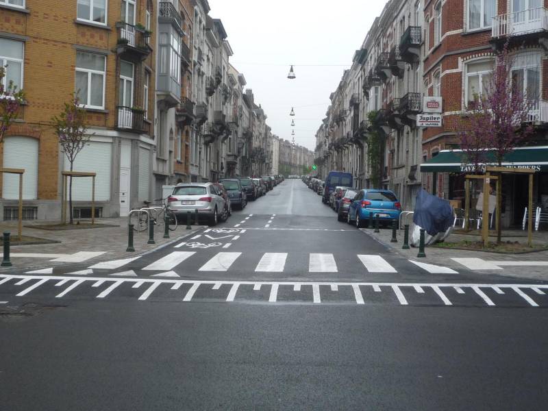 Widok z placu na ulicę Roosevelta wkrótce po remoncie. Nie ma jeszcze oznakowania pionowego drogi jednokierunkowej, widać za to dopuszczenie ruchu rowerów w obu kierunkach (powszechne w Brukseli [zobacz >>>]) podkreślone oznakowaniem poziomym jedynie miejscowo. Na pierwszym planie wyniesione przejście dla pieszych.