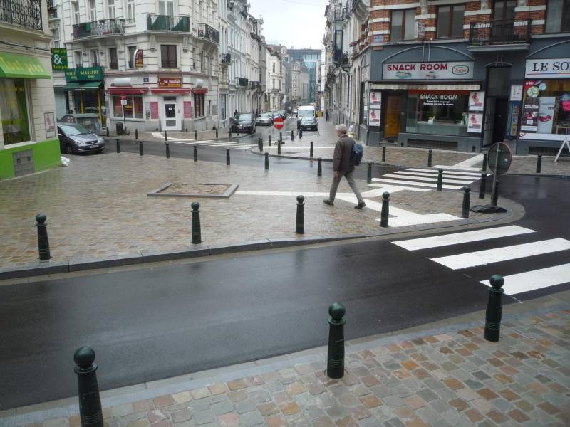 Na początek spójrzmy na centralny punkt skrzyżowania. W poprzek zdjęcia biegnie Rue des Cultes. W głębi prostopadła Voorlopig Bewindstraat. Na pierwszym planie Rue du Nord. Wszystkie z zasady jednokierunkowe. Ten wielki paraboliczny półwysep w środku zdjęcia rzuca się w oczy, ale zrobi na Was prawdziwe wrażenie dopiero wtedy, gdy zobaczycie, z jakiego morza asfaltu wyłonił się ten nowy ląd.