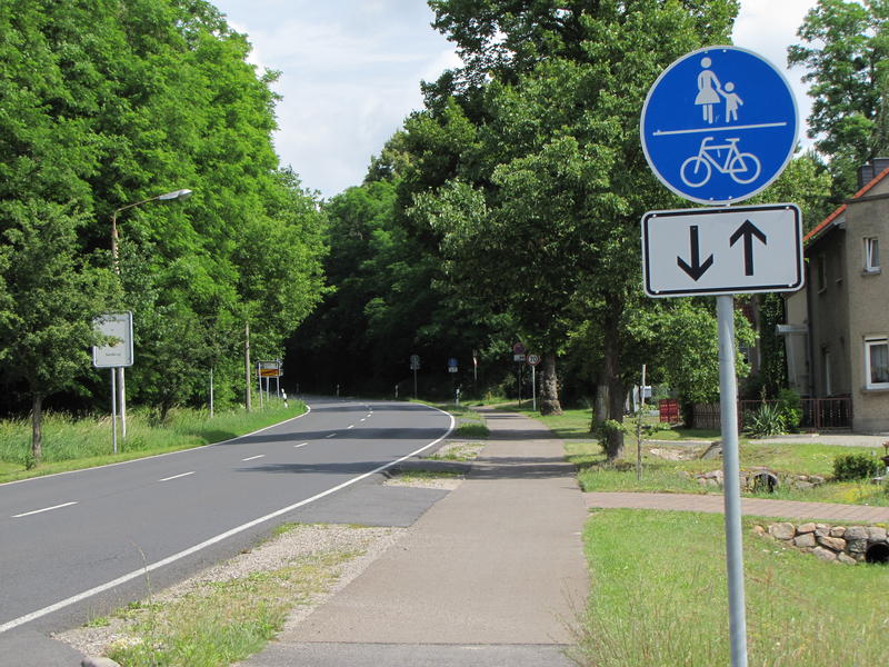 Droga federalna nr 2 w okolicy Chorin. Warto zwrócić uwagę na zachowanie ciągłości nawierzchni (oczywiście asfaltowej) ciągu pieszo-rowerowego na zjazdach na posesje.