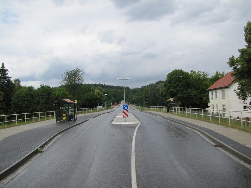 Przejście B158 przez Neukietz, w tle most na Starej Odrze. Przystanek autobusowy bez zatoki, ale za to z azylem, który uniemożliwia ominięcie autobusu zatrzymanego na przystanku i ułatwia pasażerom pokonanie jezdni. Ciąg pieszo-rowerowy (po lewej, wyjątkowo z kostki) nie zwęża się w rejonie przystanku, wręcz przeciwnie – poszerza, by wiata nie utrudniała ruchu niezmotoryzowanych wzdłuż jezdni.