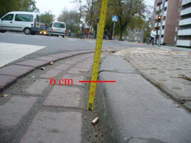 2. krawężniki tworzą zbyt wysokie progi na obniżeniach dla pieszych, przekraczające maksymalną dopuszczalną wysokość 2 cm (obecnie ich wysokość wynosi od 4 do 6 cm). Kolejną przeszkodą jest przeciwległa krawędź ścieku przykrawężnikowego, również przekraczająca 2 cm. Tak wykonana krawędź chodnika utrudnia ruch osobom prowadzącym wózki dziecięce bądź poruszające się na wózkach inwalidzkich. Koła wózków klinują się w kanale ścieku, utrudniając sprawne opuszczenie przejścia.