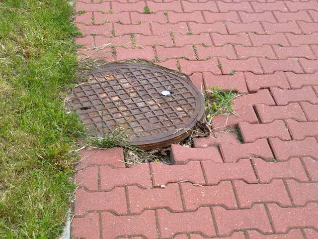 Al. Prymasa Tysiąclecia - zapadnięte okolice studzienki kanalizacyjnej.