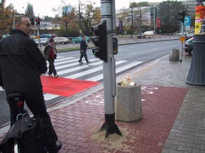 Oprócz rowerzystów, można na warszawskich drogach dla rowerów znaleźć np. sygnalizatory, latarnie, ściany, płoty, kosze na śmieci...