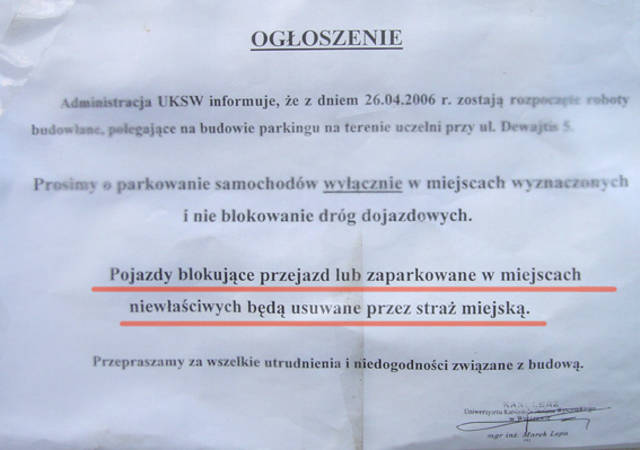 Dopiero na miejscu znajduje się kartka z niezbyt rzucającym się w oczy ostrzeżeniem, czym teraz grozi dojazd samochodem.
