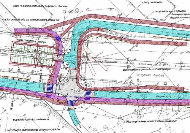 Rozwiązanie nowego węzła komunikacyjnego przy Wisłostradzie. Widać, że nie przewidziano żadnych przystanków autobusowych, a przebieg dróg rowerowych zdecydowanie (na niekorzyść rowerzystów) odbiega od dotychczasowego, co oznacza pogorszenie wygody i bezpieczeństwa.