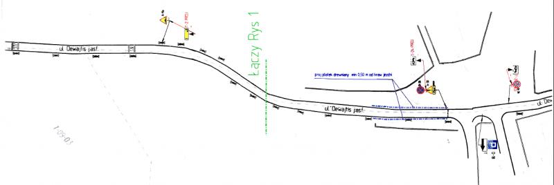 Jako dowód zamieszczamy dwa fragmenty tego projektu zawierające tylko wygrodzenia i oznakowanie. I ani śladu chodnika.