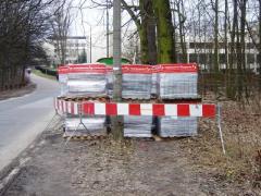 Przy skrzyżowaniu z Kamedulską naszym oczom ukazuje się wygrodzenie i pryzmy kostki brukowej.