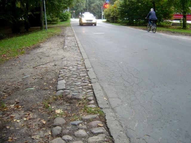 Rys.1 Obecna szerokość jezdni ul. Dewajtis wynosi 6 metrów (dwa pasy ruchu po 3 metry). Wzdłuż południowej krawędzi jezdni znajduje się brukowana opaska o szerokości 50 cm – widoczna po lewej stronie powyższego zdjęcia. Przekrój poprzeczny ulicy prezentuje Rys.2, którego wymiary podano w centymetrach.