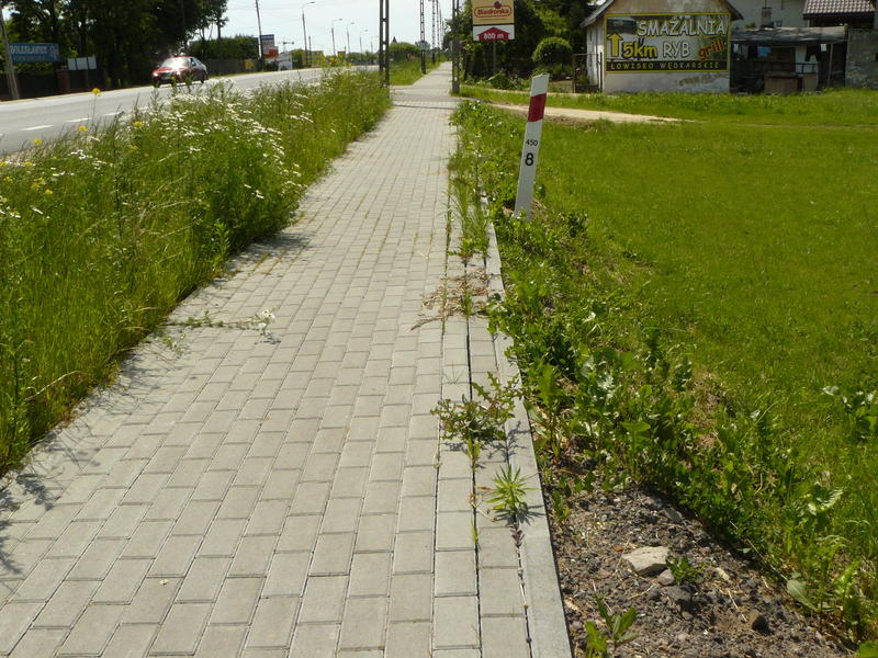 Szczeliny pomiędzy rozjeżdżającymi się rzędami kostki, w tle widoczne słupy w skrajni.