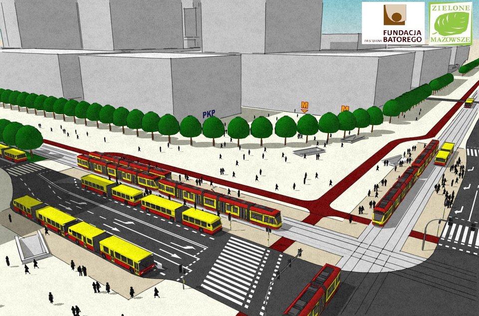 Wariant 2 - widok na zintegrowany węzeł przesiadkowy w północno-zachodnim narożniku skrzyżowania.