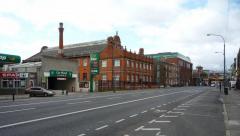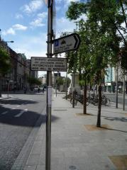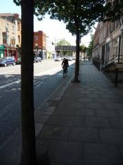 Warto zwrócić uwagę, że choć zdarzają się w stolicy Irlandii sześciopasmowe ulice, dużo rzadziej są na nich więcej niż dwa pasy dla samochodów. Częstszym wyjściem, jak na zdjęciu, jest jeden pas dla rowerów, jeden dla autobusów i jeden dla samochodów w każdym kierunku. Dwa, jeżeli doliczyć miejsca parkingowe oddzielone strefą buforową od pasa dla rowerów. W tle po prawej antyzatoka autobusowa.