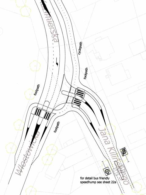Specjalne pasy przeprowadzą rowerzystę przez skrzyżowanie z drogą przelotową oraz pozwolą mu bezpiecznie włączyć się do ruchu. Na granicy strefy Tempo 30 próg spowalniający przyjazny dla autobusów.