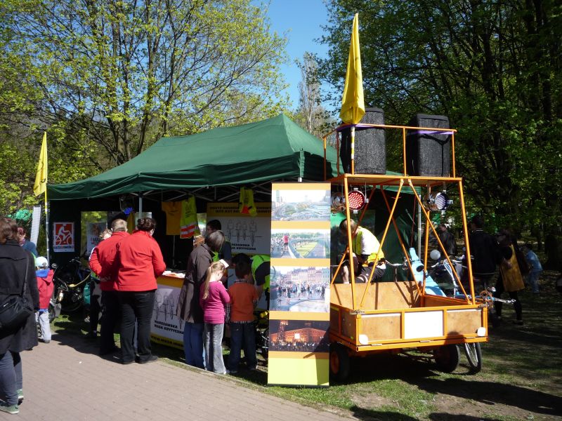 Stoisko Warszawskiej Masy Krytycznej i Zielonego Mazowsza zostało dostarczone za pomocą pojazdów napędzanych siłą ludzkich mięśni, głównie rikszą (po prawej).