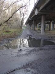 Brak odwodnienia przy północnym przyczółku wschodniej estakady - pędzących z góry rowerzystów zaskakuje istne błotniste jezioro.