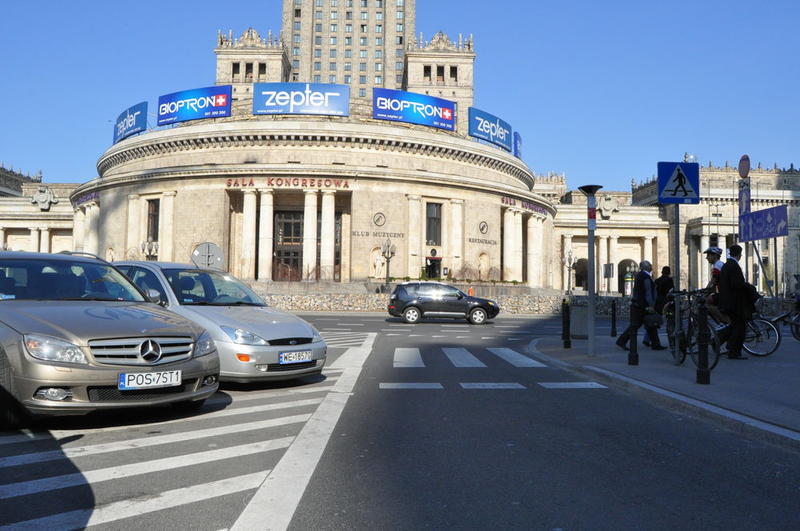 Zwiedzanie ulicy zaczęliśmy od przejścia na ulicy Złotej. Z racji na nieudolność Straży Miejskiej [zobacz >>>] [zobacz >>>], osoba niepełnosprawna zza nielegalnie parkujących aut jest zwyczajnie niewidoczna - nawet wtedy, gdy już znajduje się na jezdni.