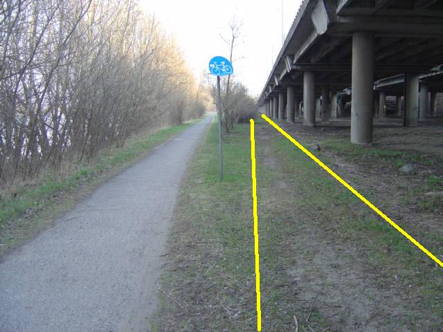 Dla porządku przypominamy, że przez ponad 30 lat istniała tu wydzielona droga dla rowerów z oznakowaniem pionowym C-13. Czy jego likwidacja i wprowadzenie znaków C-13/16 nastąpiło na podstawie zatwierdzonego projektu stałej organizacji ruchu? Żółte linie wskazują, gdzie pod trawnikiem wyrosłym na piachu z estakad znajduje się chodnik.