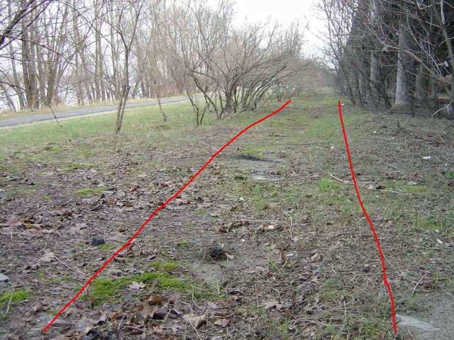 Jeden z dawnych ciągów asfaltowych, zasypany piachem z jezdni, jest już całkowicie zarośnięty.