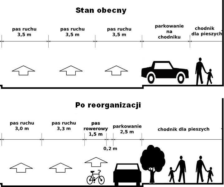 Podstawowym założeniem projektu jest stworzenie ulicy bardziej przyjaznej dla ruchu lokalnego. W tym celu jeden z pasów ruchu na jezdni zostaje przekształcony w dwa: parkingowy i rowerowy.
