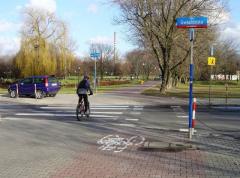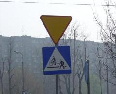 Na wyżej opisanym skrzyżowaniu roweru nie ma na znakach drogowych, za to licznie pojawia się na drodze. Tutaj jest odwrotnie - rower dumnie prezentuje się na znaku, mimo że na jezdni pojawia się może raz na tydzień a nawet rzadziej. Skąd więc i po co to ostrzeżenie kierowców przed wjeżdżającymi na jezdnię rowerzystami?