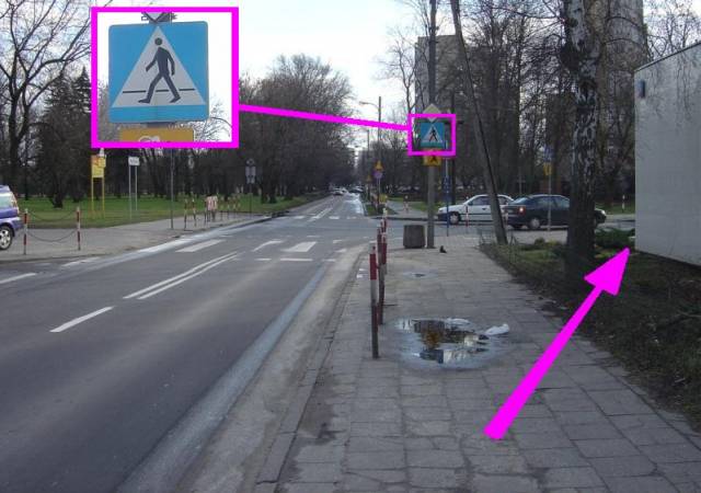 Dojeżdżającym do skrzyżowania ul. Gwiaździstą od północy znacznie ogranicza widoczność powstały nie tak dawno narożny budynek wskazany strzałką. Droga z pierwszeństwem przejazdu zachęca do szybkiej jazdy. Z nieznanych przyczyn nie umieszczono przepisowego oznakowania przejazdu rowerowego przez jezdnię. Kierowcy wprowadzeni w błąd znakiem informacyjnym D-6 nie spodziewają się rowerzystów.