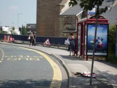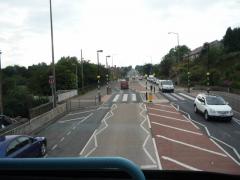 Kompleksowe ujęcie stosowanego w Anglii podejścia do projektowania dróg: poszerzony chodnik przy przejściu dla pieszych, nie tylko fizyczne lecz również optyczne zwężenie jezdni (połamane linie wzdłuż pasów samochodowych), częste wysepki dające schronienie pieszym oraz uniemożliwiające wyprzedzanie. Przy okazji pasy rowerowe. W Warszawie taki przekrój drogi zostałby prawdopodobnie wykorzystany na jezdnię 2x3 pasy ruchu (bez miejsc parkingowych) - tym bardziej że jest to jedna z dróg wylotowych z miasta. O dziwo korków nie było.