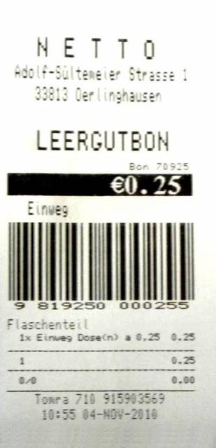 Po wepchnięciu wszystkich opakowań naciskamy przycisk ,,końca transakcji'', na co maszyna drukuje kupon z łączną kwotą. W kasie zamienia się go na gotówkę. Co więcej - nie trzeba się legitymować paragonem zakupu z danego sklepu, tak jak w Polsce. Wystarczy aby puszka czy butelka pochodziła z asortymentu danej sieci, miejsce zakupu może leżeć na drugim końcu Niemiec.