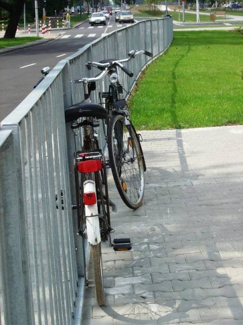 Rowery stoj± przypięte do barierek czy latarni,...