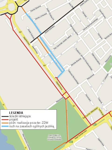 Po paru iteracjach udało się osiągnąć kompromis w zasadzie umożliwiający podróżowanie rowerem po obu stronach ul. Jagiellońskiej, a nie wymagający budowy podwójnej ilości ścieżek, dzięki wykorzystaniu ulic lokalnych: Skoczylasa i Burdzińskiego.