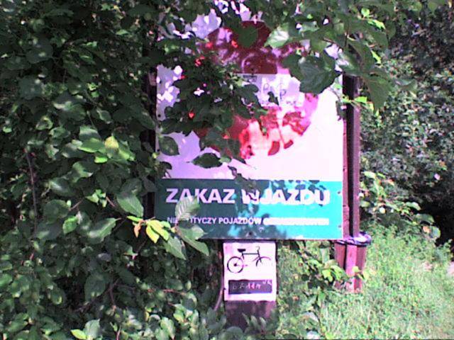 ...trafia na szlaban i zakaz wjazdu (wyłączono jedynie „pojazdy oznakowane”, co w tym kontekście na pewno nie oznacza rowerów). Bezpośrednie sąsiedztwo znaku zakazu i drogowskazu dla rowerów nikogo jakoś dotąd nie zdziwiło.