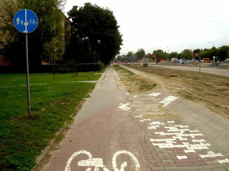 Teraz przenieśmy się w okolice ul. Przy Agorze. Wprawdzie jakość nawierzchni nie odbiega tu aż tak bardzo od średniej, ale gdyby kogoś zaniepokoiła np. kolorystyka, to znak pionowy zachęci go do dalszej jazdy. O utrudnieniach czy objazdach tu także ani słowa.