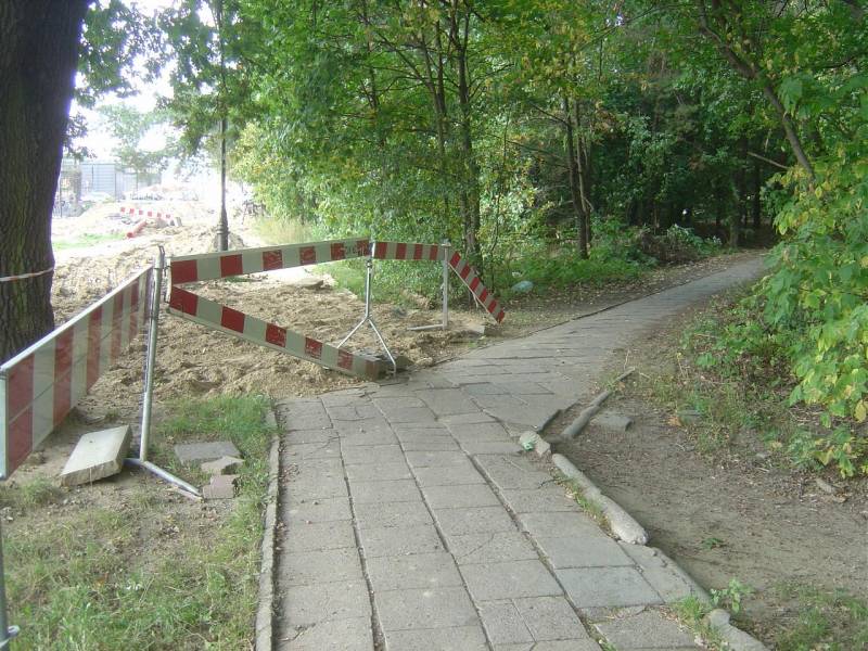 Wobec braku przejazdu i braku oznakowania jedziemy dalej chodnikiem. Po 20 metrach skręca on w las. Mamy do wyboru - przedzierać się półlegalnie wzdłuż ściany lasu ryzykując oskarżenie o wdarcie się na plac budowy albo szukać szczęścia na leśnych ścieżkach. Przyjmijmy ten drugi wariant.