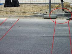 Widząc, jak bardzo zatarło się oznakowanie P-11 na wschodniej nitce, trudno mieć pretensję do budowniczych, że zapomnieli. I krawężnik ułożyli z rozpędu tak jak widać na tym zdjęciu (kreski wskazują zatarte znaki P-11). Potem musieli go obniżyć.